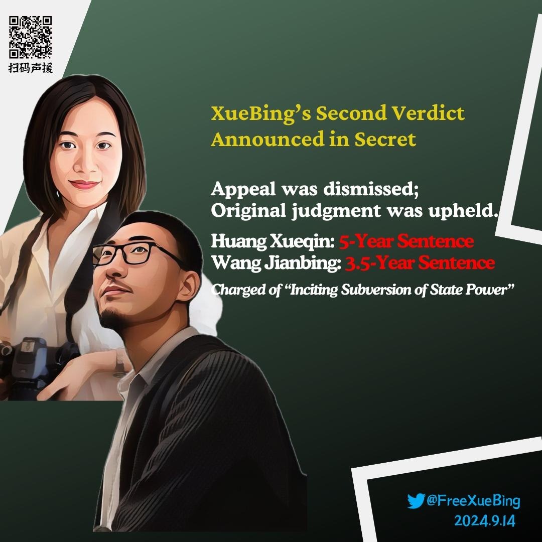 2024年9月13日,律师在会见黄雪琴期间才意外得知:黄雪琴、王建兵涉嫌“煽动颠覆国家政权”一案(雪饼案)二审已被秘密宣判,而代理雪饼二人共四位辩护律师在此前均未收到任何通知和文件,雪饼两人自辩权和律师辩护权均被变相剥夺。