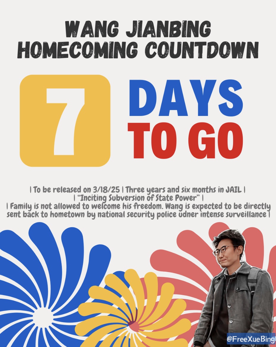 #WangJianbing of #XueBing is to be RELEASED in 7 days, on March 18, after 3 years and 6 months in jail, while #HuangXueqin still has 1.5 years left to serve. As his release nears, the prison is no longer allowing lawyers to meet with him and has told his family that they will not be allowed to pick him up & celebrate his freedom. Instead, national security police will “send” Wang directly back to Tianshui, Gansu, Wang’s hometown. The supporting team will closely monitor the release situations of Wang. We demand he be returned home safe, free, and in good health!